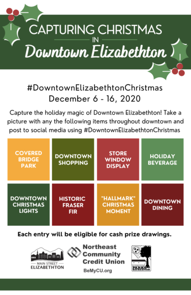 Visit mainstreetelizabethton.com or bemycu.org to download the instructions mentioned above. Each photo entry submitted by December 16 using #DowntownElizabethtonChristmas will be eligible for cash prize drawings, sponsored by Northeast Community Credit Union. Prizes include six $50 Visa gift cards and a grand prize of $100 Visa gift card. Winners will be announced by Friday, December 18th and prizes will be awarded in the Covered Bridge Park.