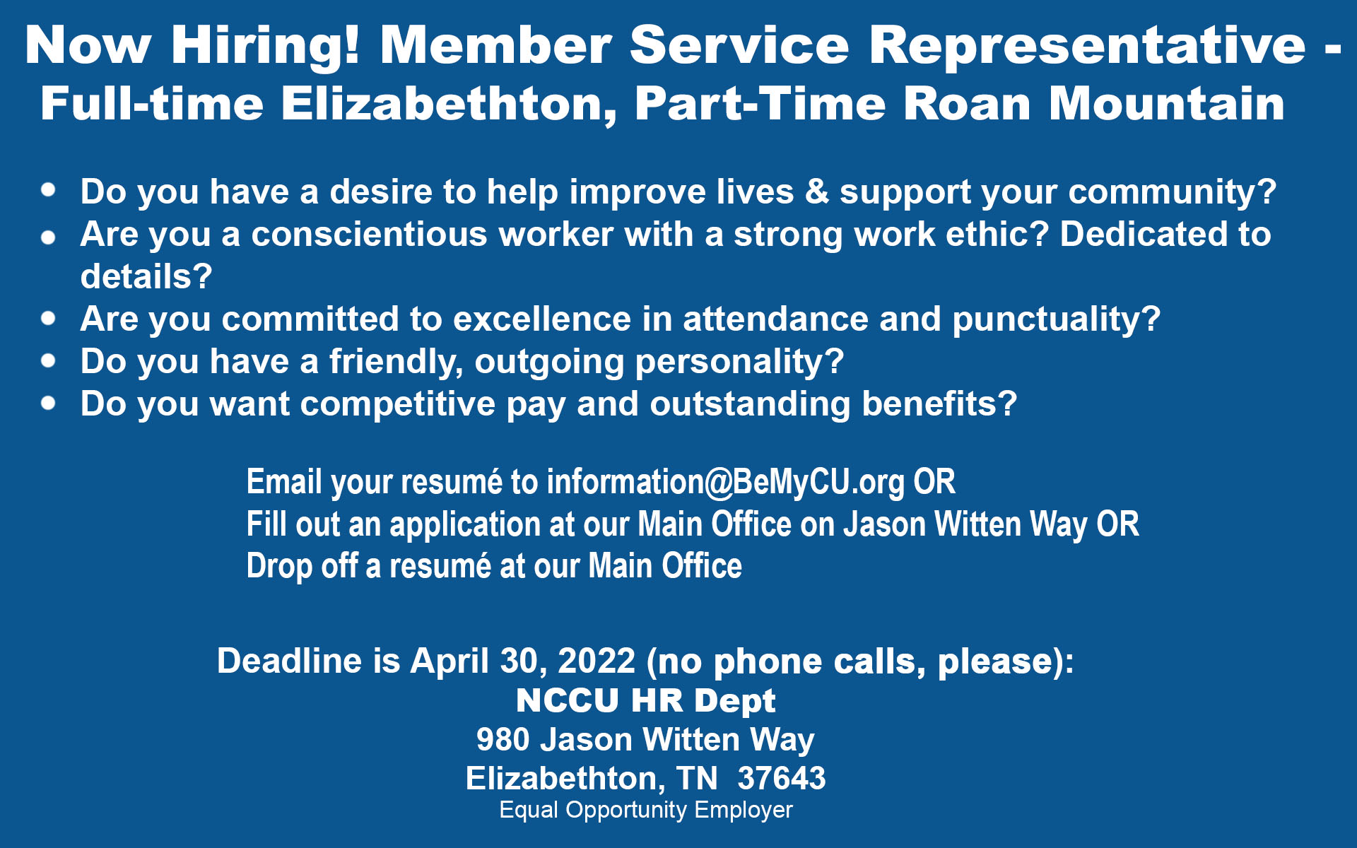 - Mail your resume to our main office – NCCU HR Dept, 980 Jason Witten Way, Elizabethton, TN 37643.